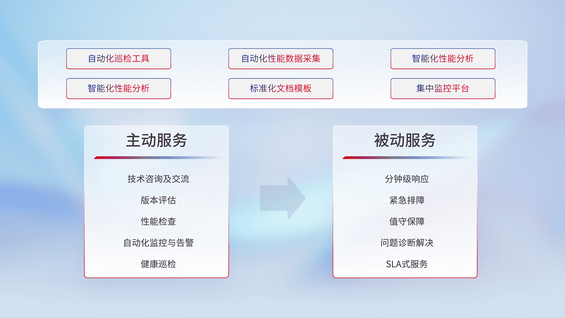 智能化工具和标准化文档,,保障服务质量,,,提供主动服务(包含技术咨询、、版本评估、、、、性能检查、、自动化监控与告警、、、、健康巡检)和被动服务包含(分钟级响应、、、紧急排障、、值守保障、、、、问题诊断解决、、、SLA服务)。。