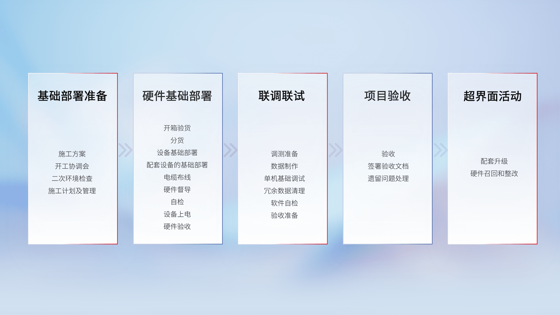 从基础部署准备、、、、硬件基础部署、、联调联试、、、项目验收、、、、越界面活动的全过程可追溯,,,保证施工质量和进度。。。
